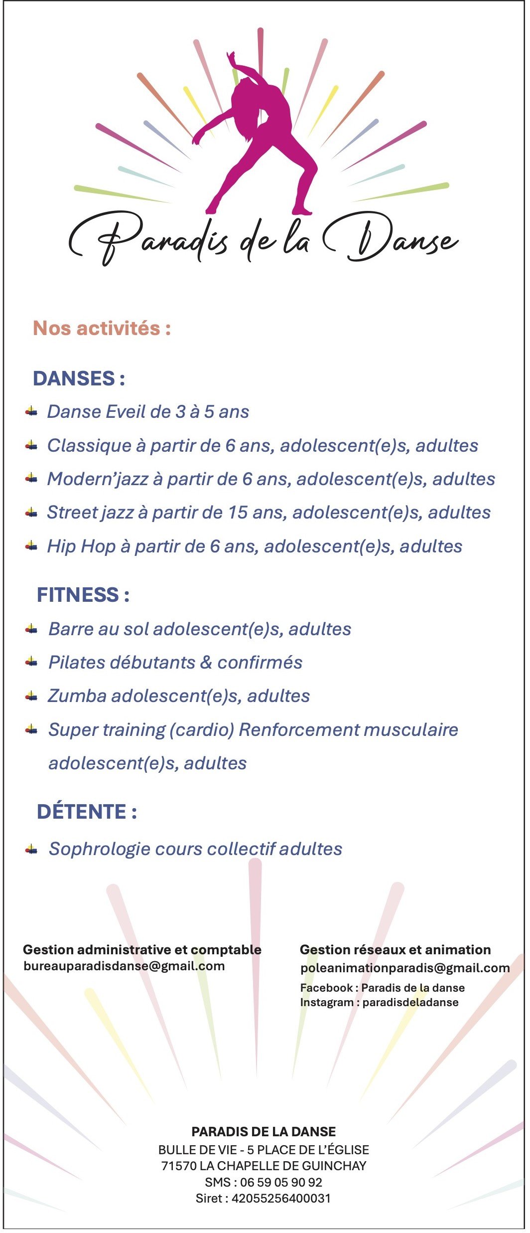 Jazz, éveil, classique, hiphop, breakdance, zumba, pilates, renfo, classique baby, enfants, ados adultes, stretching, Low impact, street jazz.