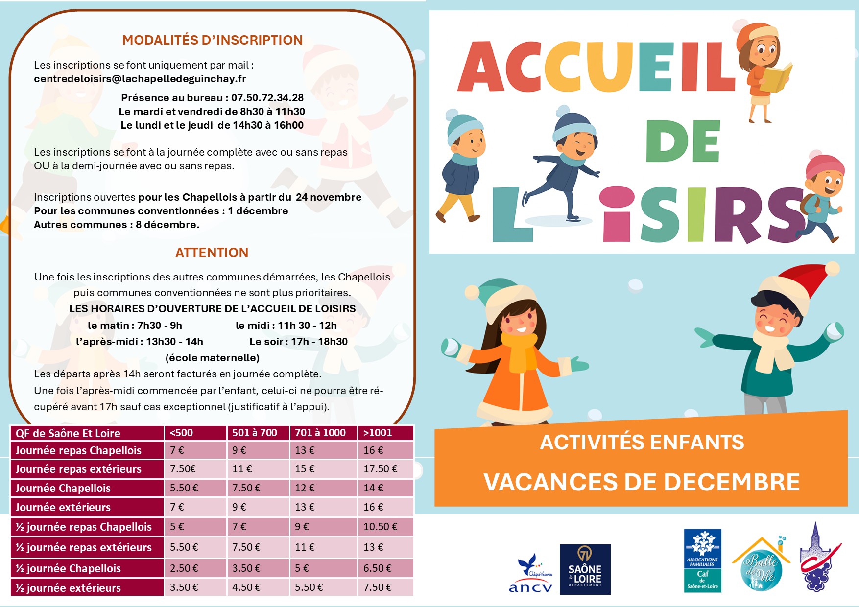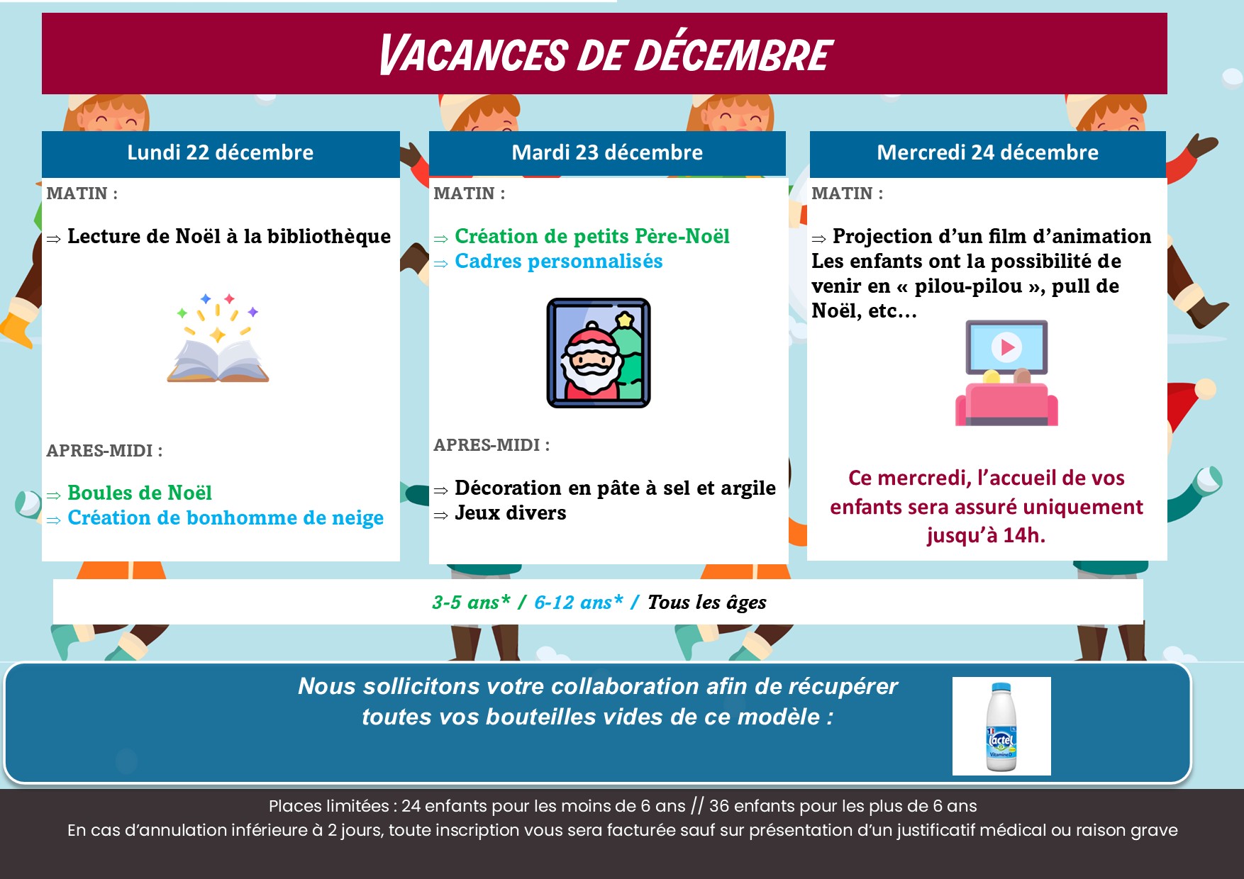 Accueil des enfants scolarisés et/ou à partir de 3 ans (révolus) à 12 ans de 7h30 à 18h30 au plus tard soit 3, 4 ou 5 journées complètes dans la semaine avec ou sans repas. 📍 Lieu : Ecole élémentaire