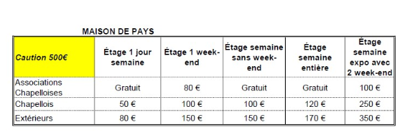 - Les réunions : espace + hall : 50 € / totalité de l'étage : 80 €